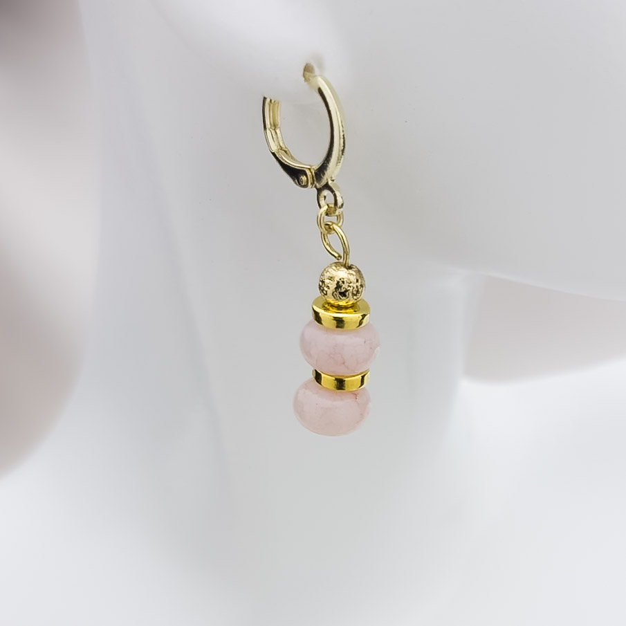 Elegant dangling pink gemstones with gold accents and a gold filled ear huggie clasp. Classy, yet simple enough for everyday wear.
