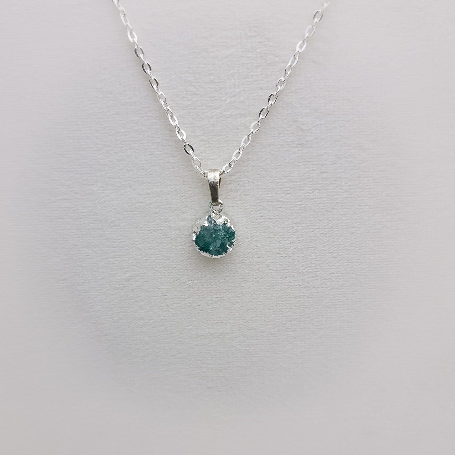 Dazzling aquamarine gemstone with silver casing and chain. Perfect accessory for casual evenings.