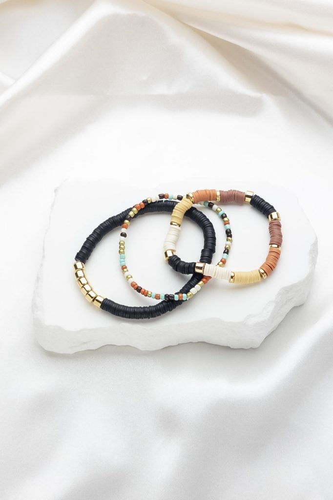set of 3 Black, Tan, Cream and gold beaded bracelets