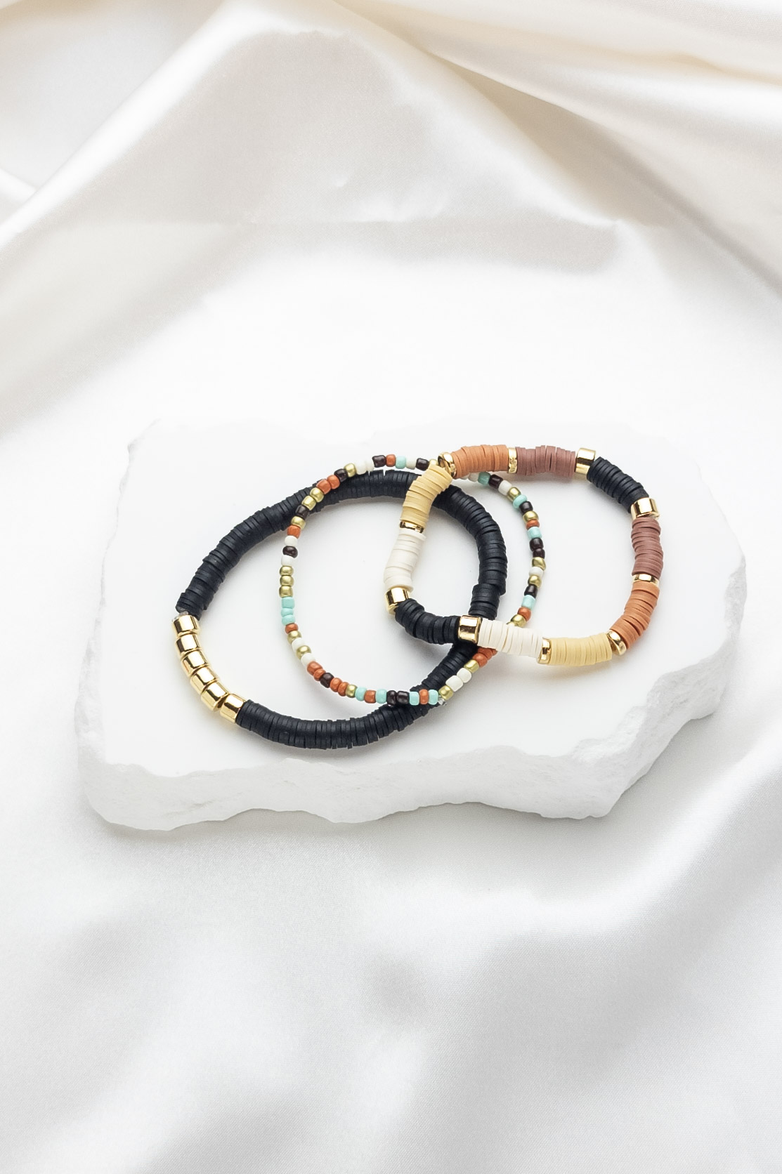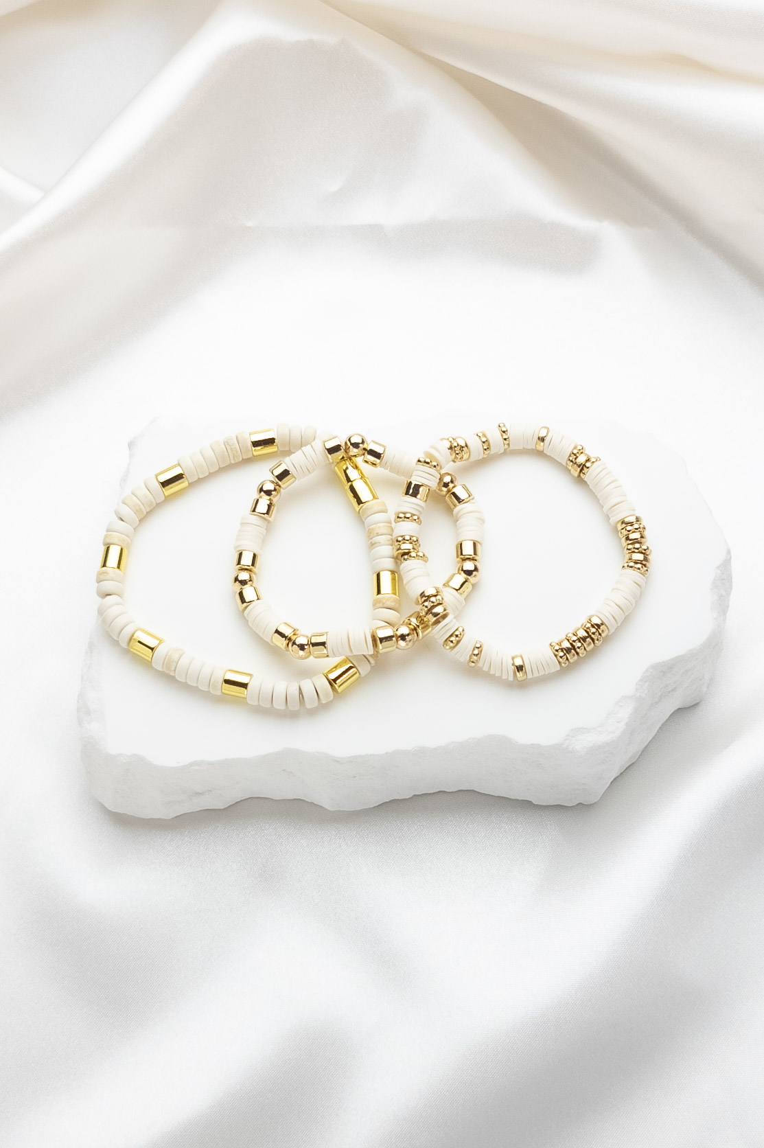 set of three coordinating cream and gold chic bead bracelets.